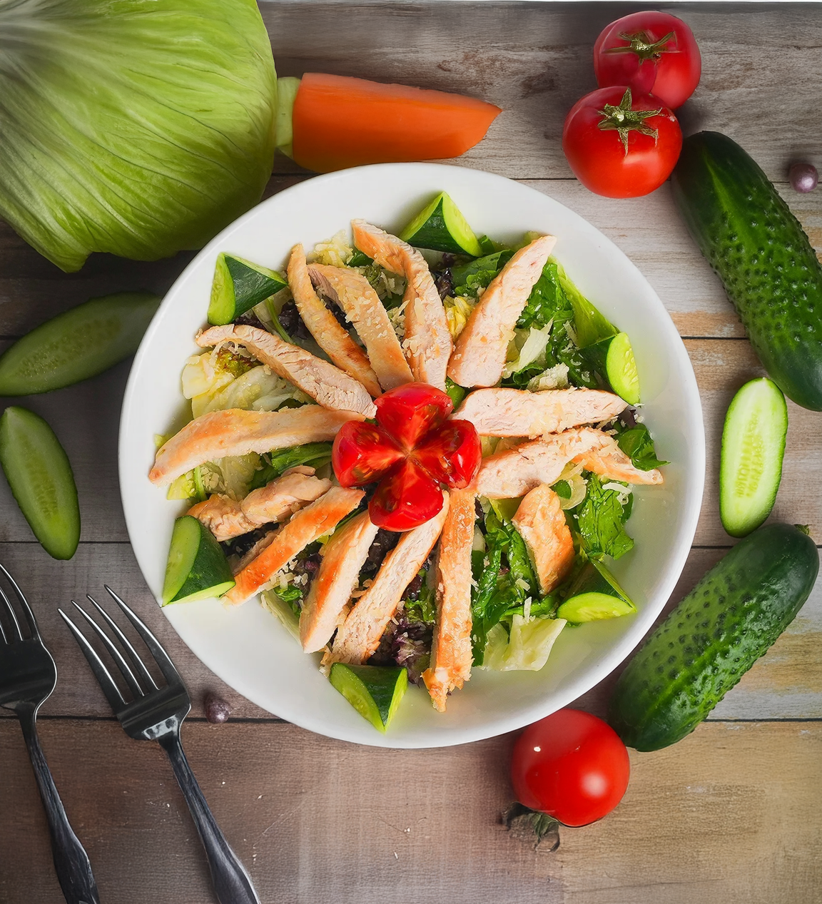 Tavuk,mevsim yeşillikleri ,zeytin, mısır ,domates ,salatalık, ceviz ,badem, balzemik sos, portakal